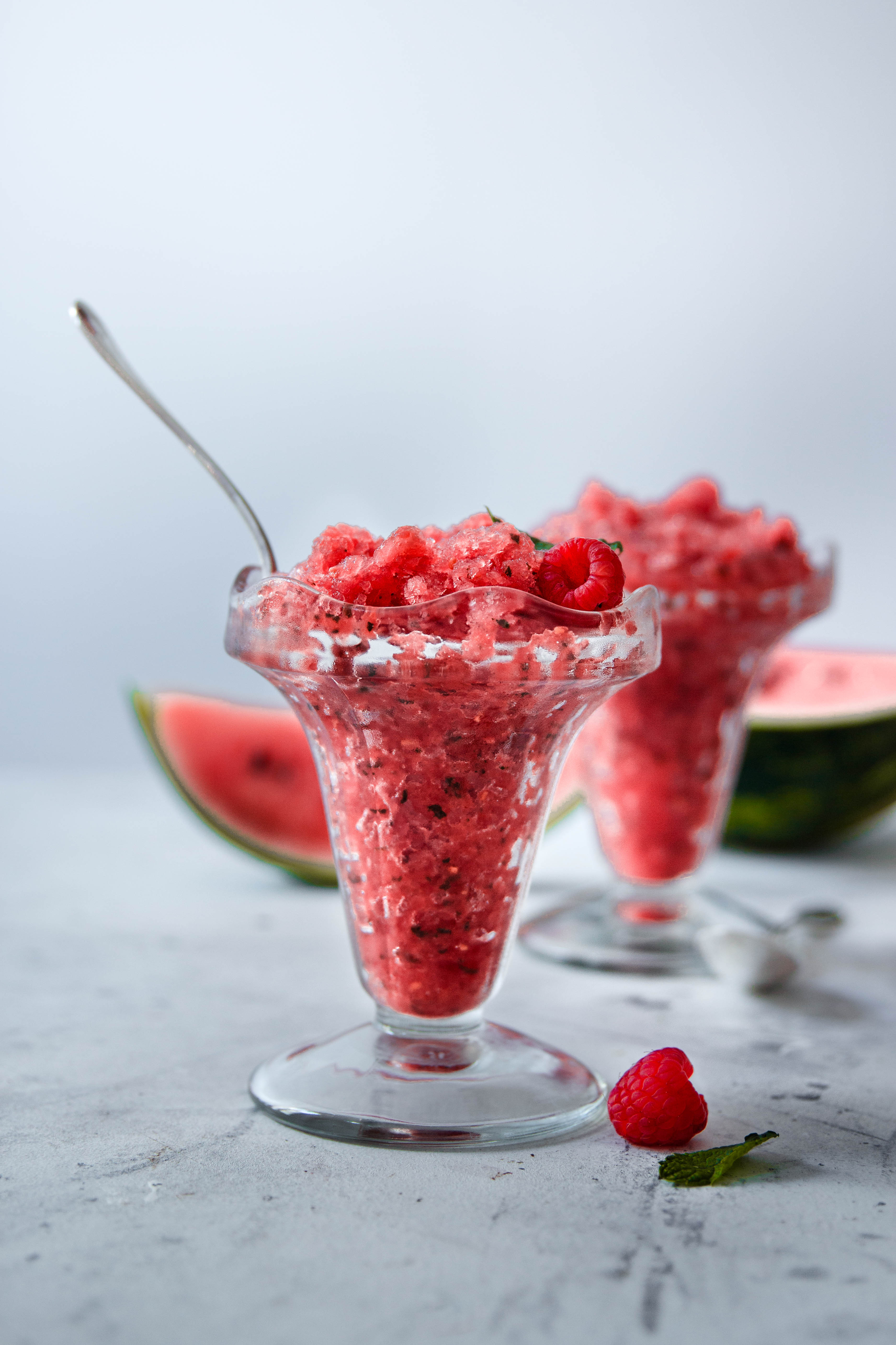 3 – Servir le granité dans des verres, ajouter pourquoi pas quelques framboises ou feuilles de menthe en décoration, et servir.