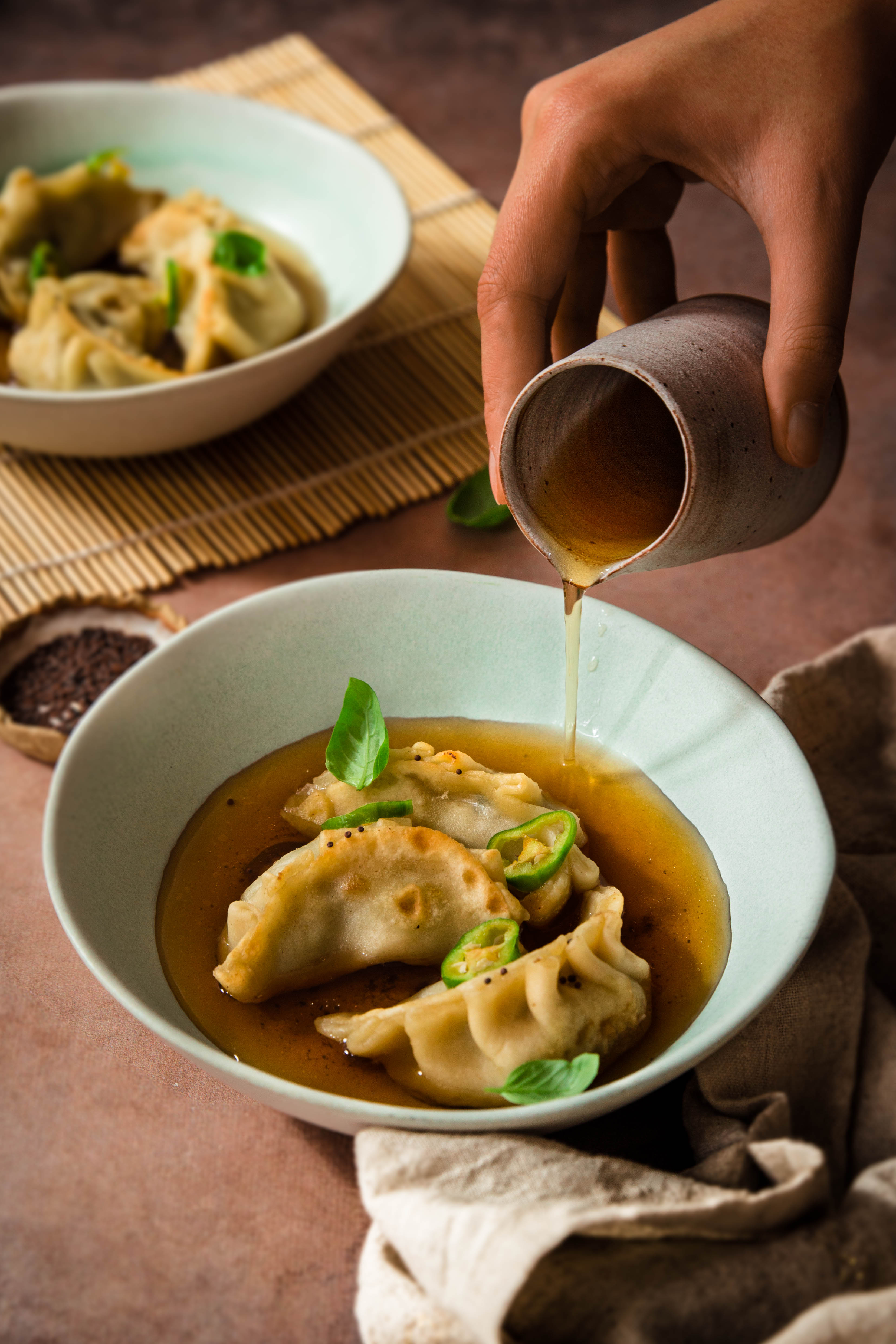 Gyozas végétariens au chou pak choï et bouillon asiatique - photography
