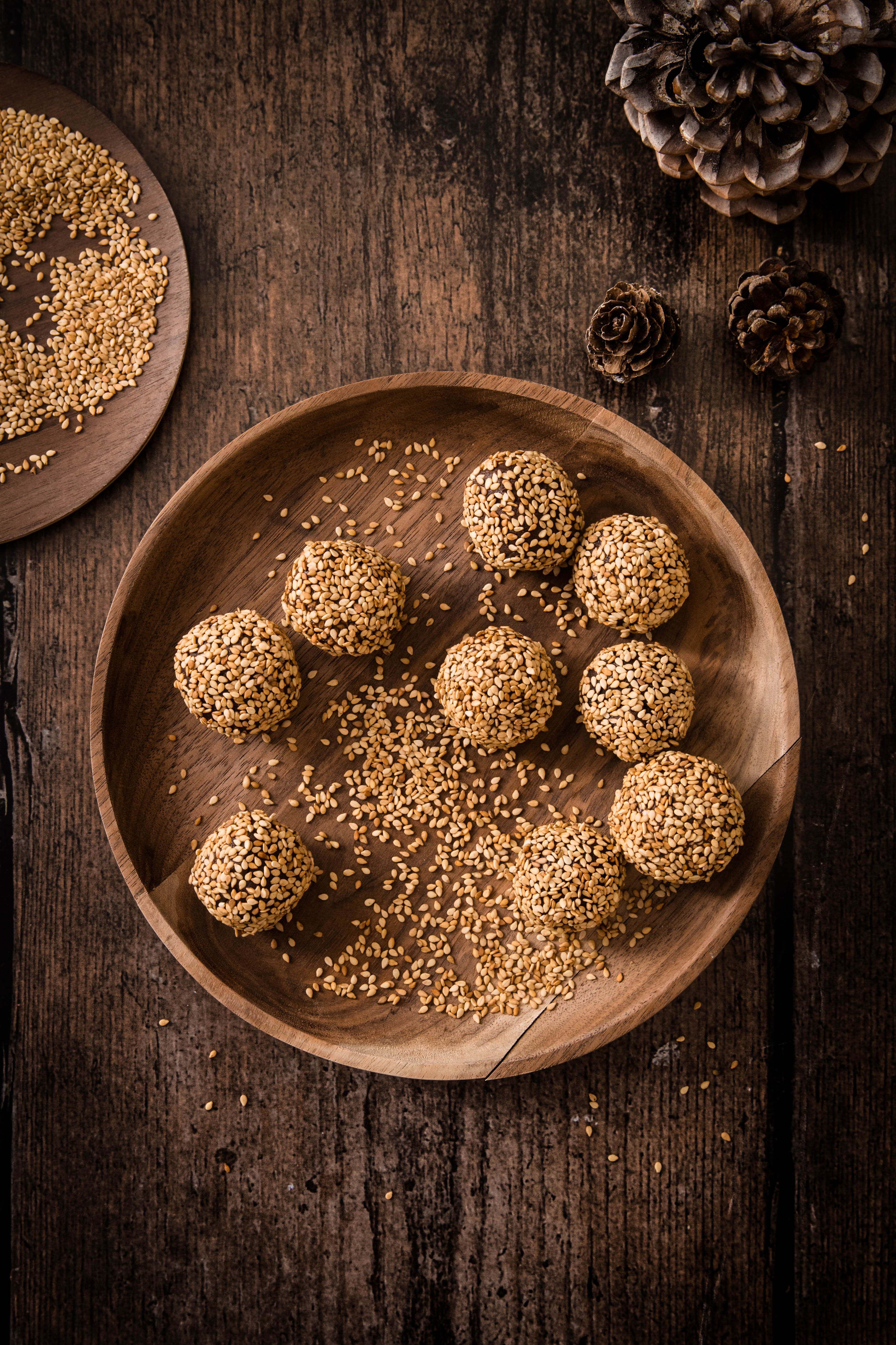 La petite originalité de ces truffes ci, c’est qu’elles ont un bon goût de sésame. Pour celles et ceux qui aiment le sésame à petite dose, la purée de sésame à l’intérieur des truffes sera d’une douceur infinie, il suffira ensuite de les enrober d’un peu de cacao. En revanche pour les accros au sésame, je vous invite à les rouler dans du sésame grillé, pour un goût puissant et une texture originale. Vous verrez, elles sont délicieuses à souhait !