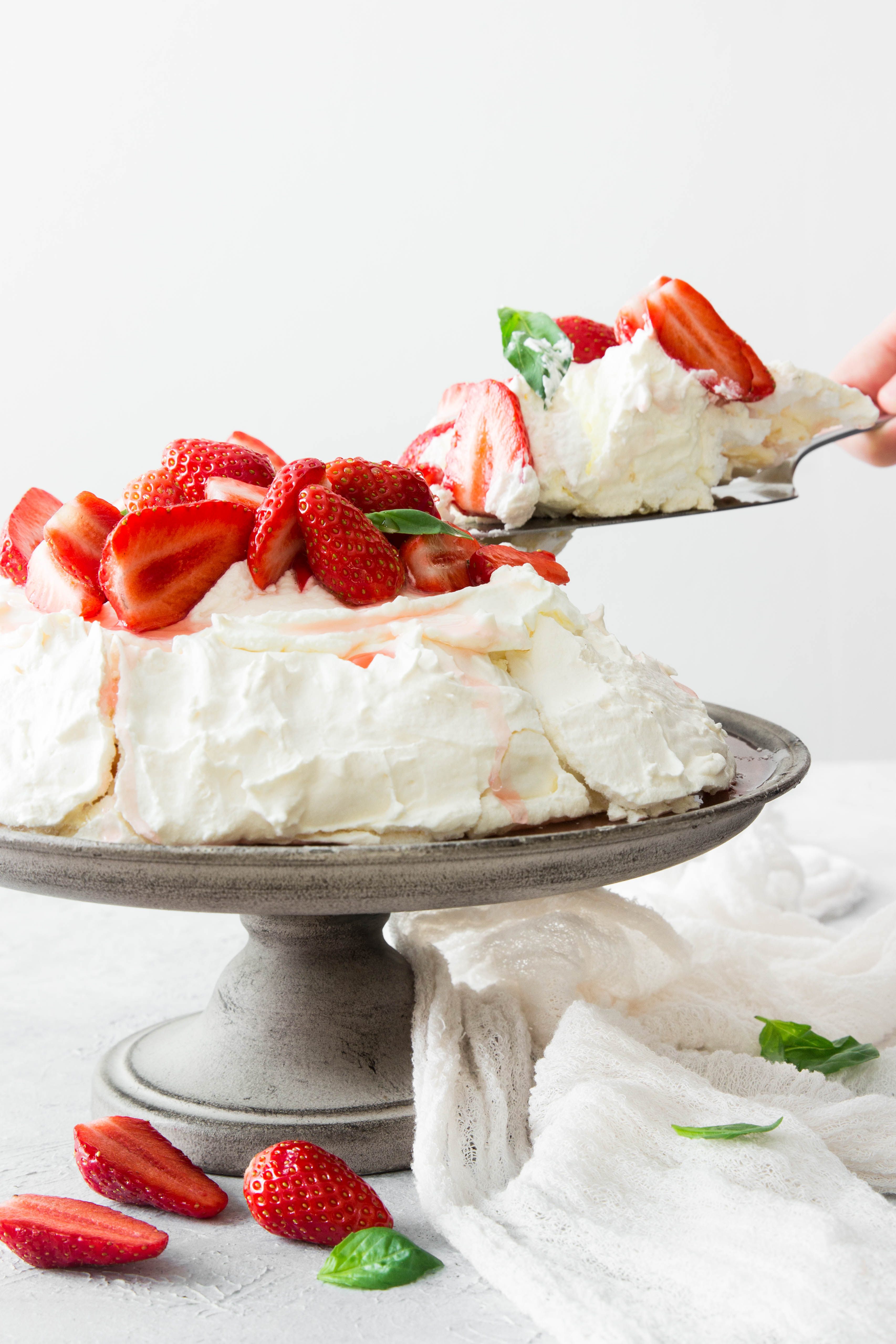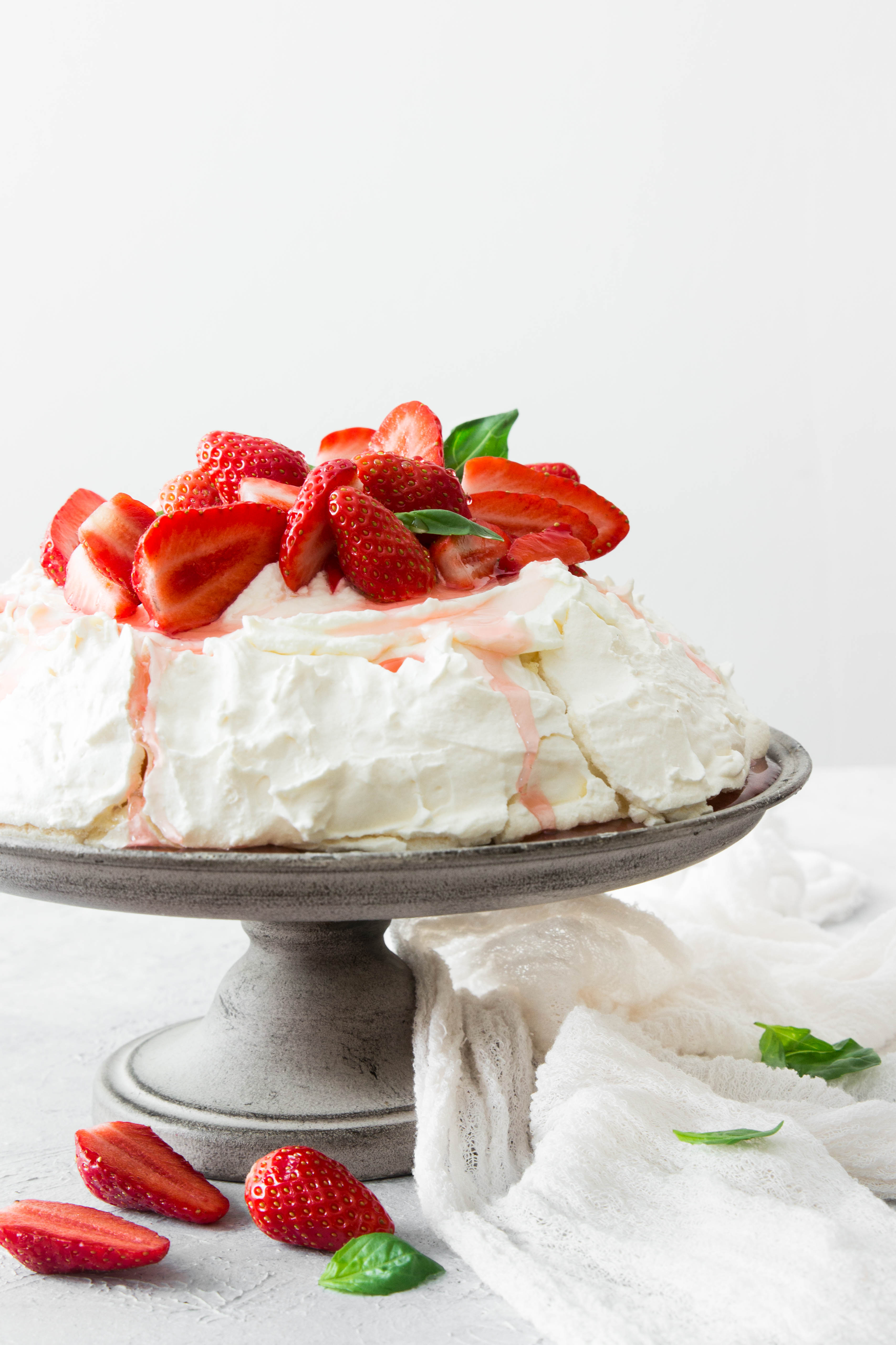 Aujourd’hui je vous poste ce que je pense être l’un de mes desserts favoris de tout le blog : le pavlova aux fraises et basilic ! Mon anniversaire étant aujourd’hui (happy birthday to me!), il fallait au moins ça pour marquer le coup par ici.