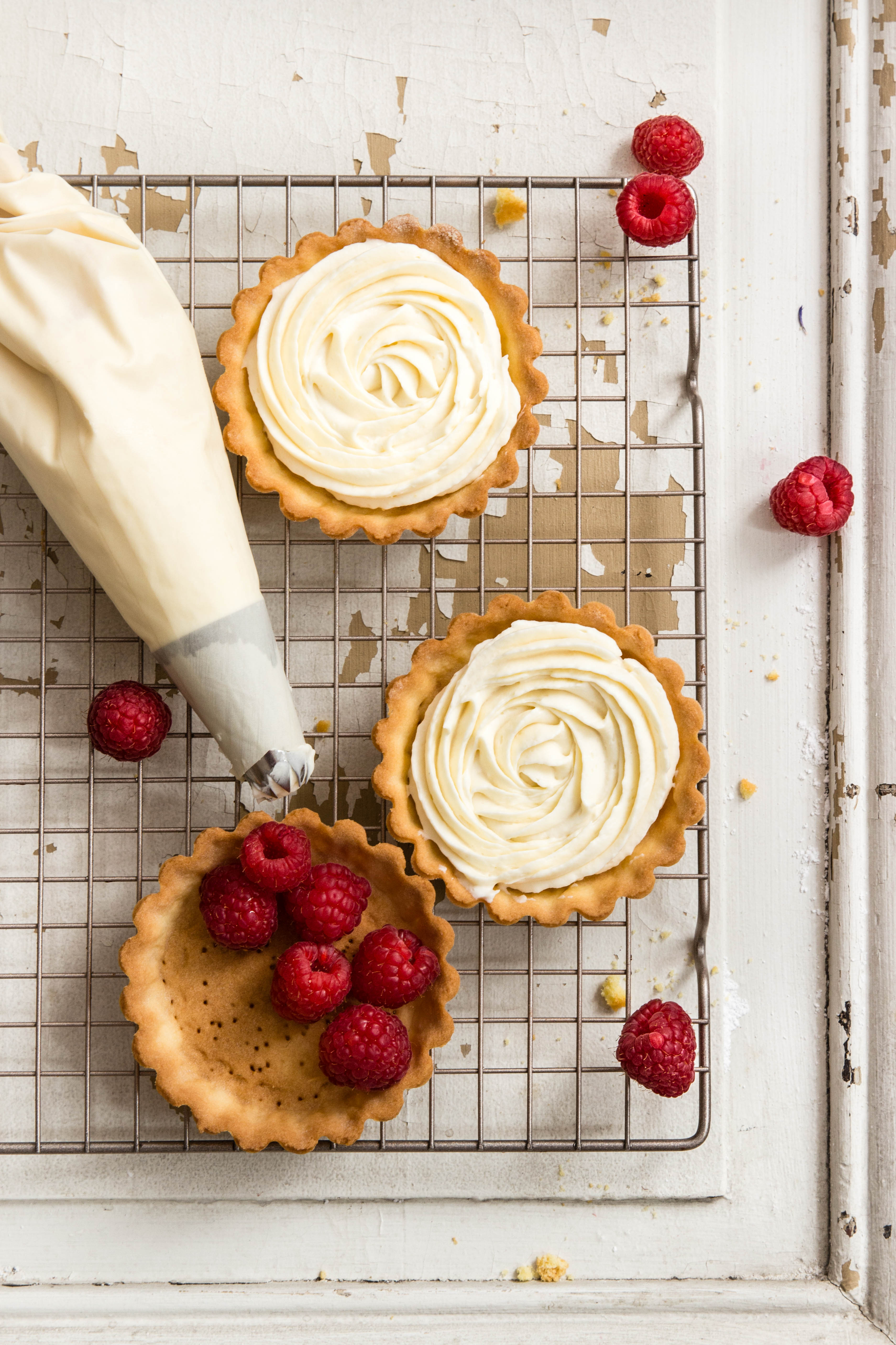 2 – Battre la ganache au batteur jusqu’à obtention d’une belle ganache montée. Ajouter le mascarpone, battre à nouveau. Pocher la ganache dans les fonds de tarte, déposer les framboises face bombée vers le haut, et les saupoudrer légèrement de sucre glace.