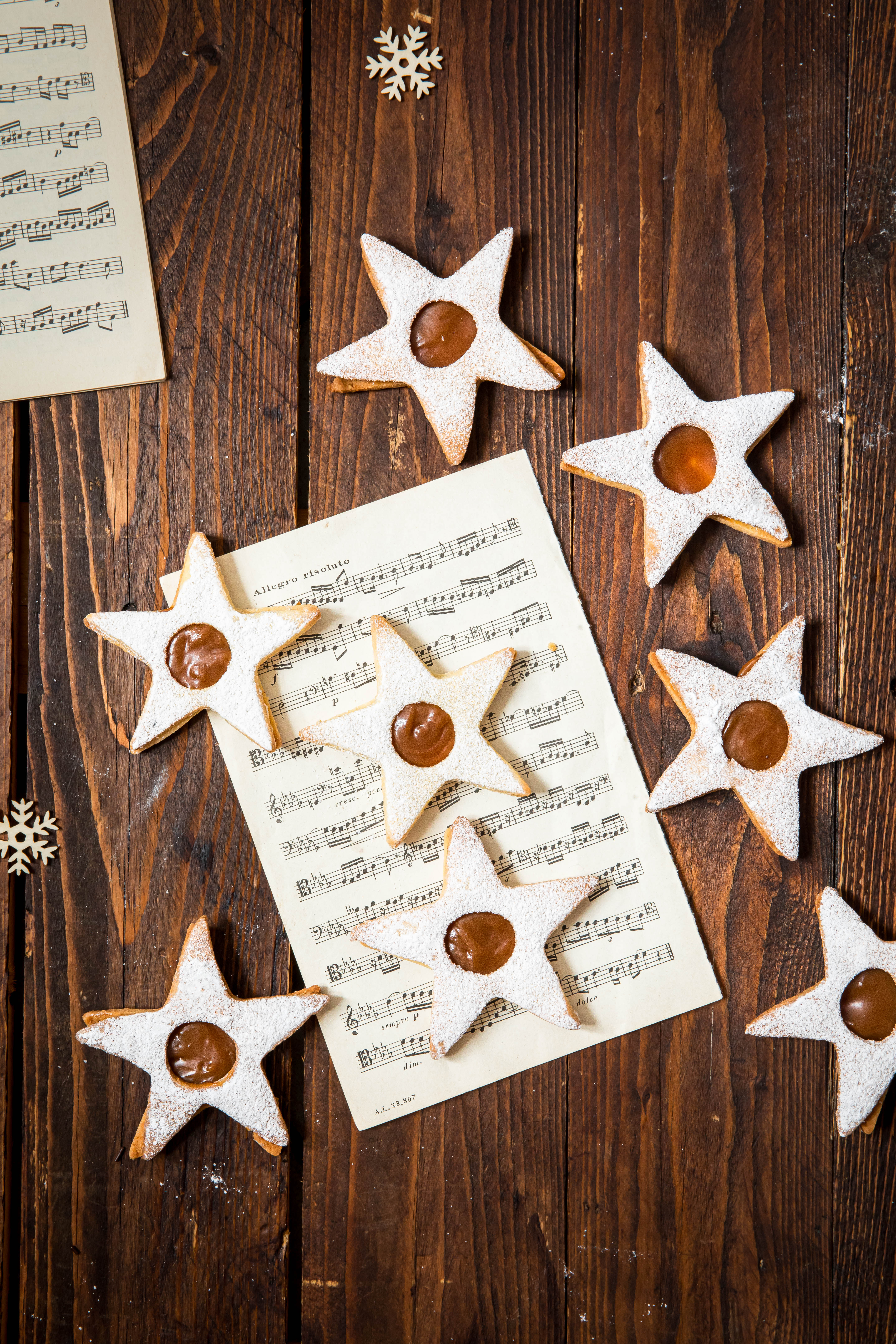 4 – Saupoudrer un peu de sucre glace sur tous les sablés “étoile” avec un trou. Déposer ensuite une petite cuillère de caramel au beurre salé au centre de tous les sablés plein, et les fermer avec les autres.